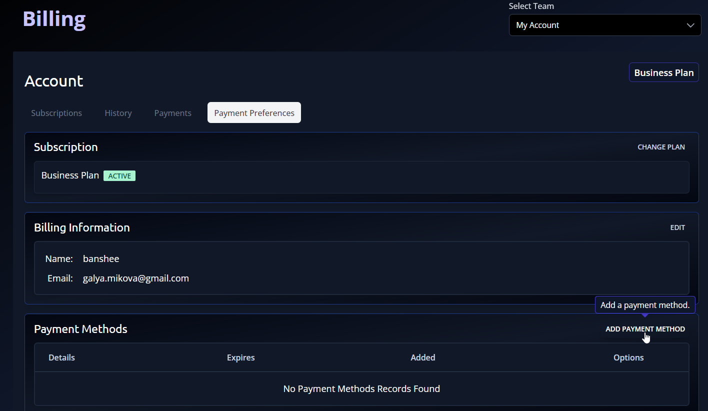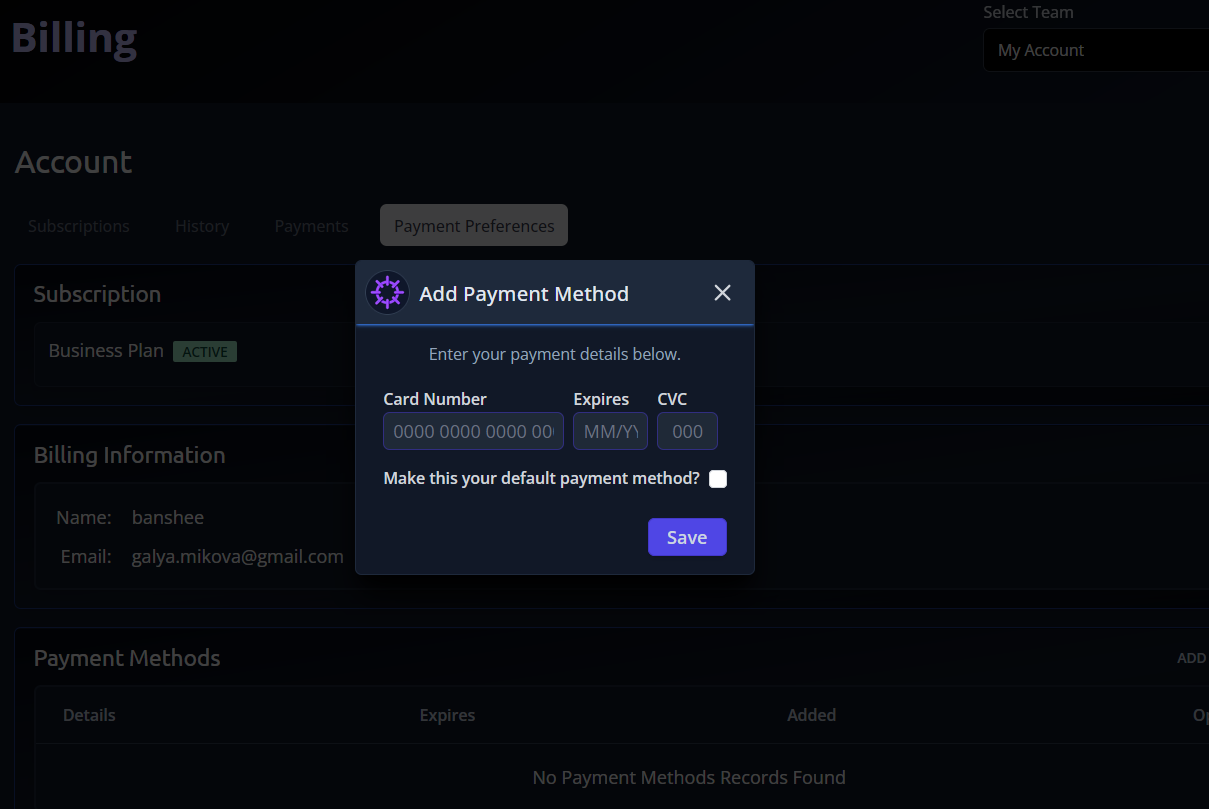 Section titled “How to change the billing method”Nirvana Labs supports various billing methods for accessing the paid managed RPC services. You can access them from the Payment Preferences tab in the Billing section of the Dashboard.
