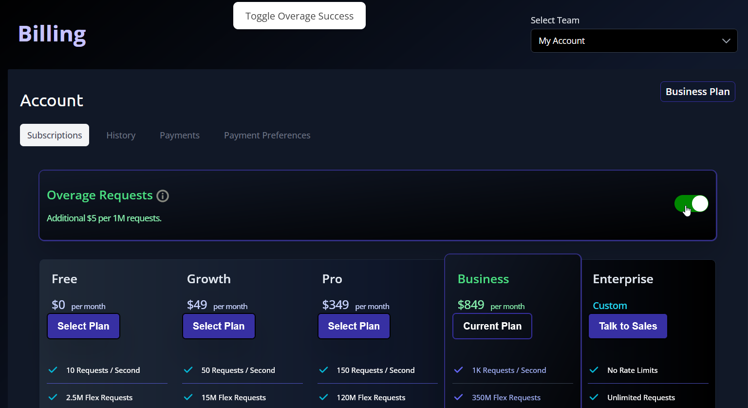 Section titled “Enabling Overage Requests”If you want to stay on your current plan but continue sending API requests after reaching your monthly limit, you can enable overages.