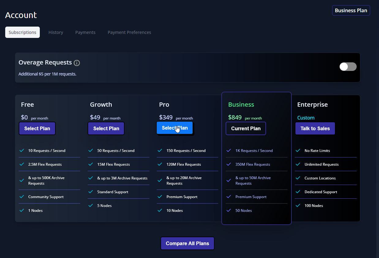 Section titled “How to upgrade or downgrade your plan”The managed RPC services come with both Free and Paid service plans but differ significantly in rate throughput, request rates and other performance metrics depending on the plan selected.